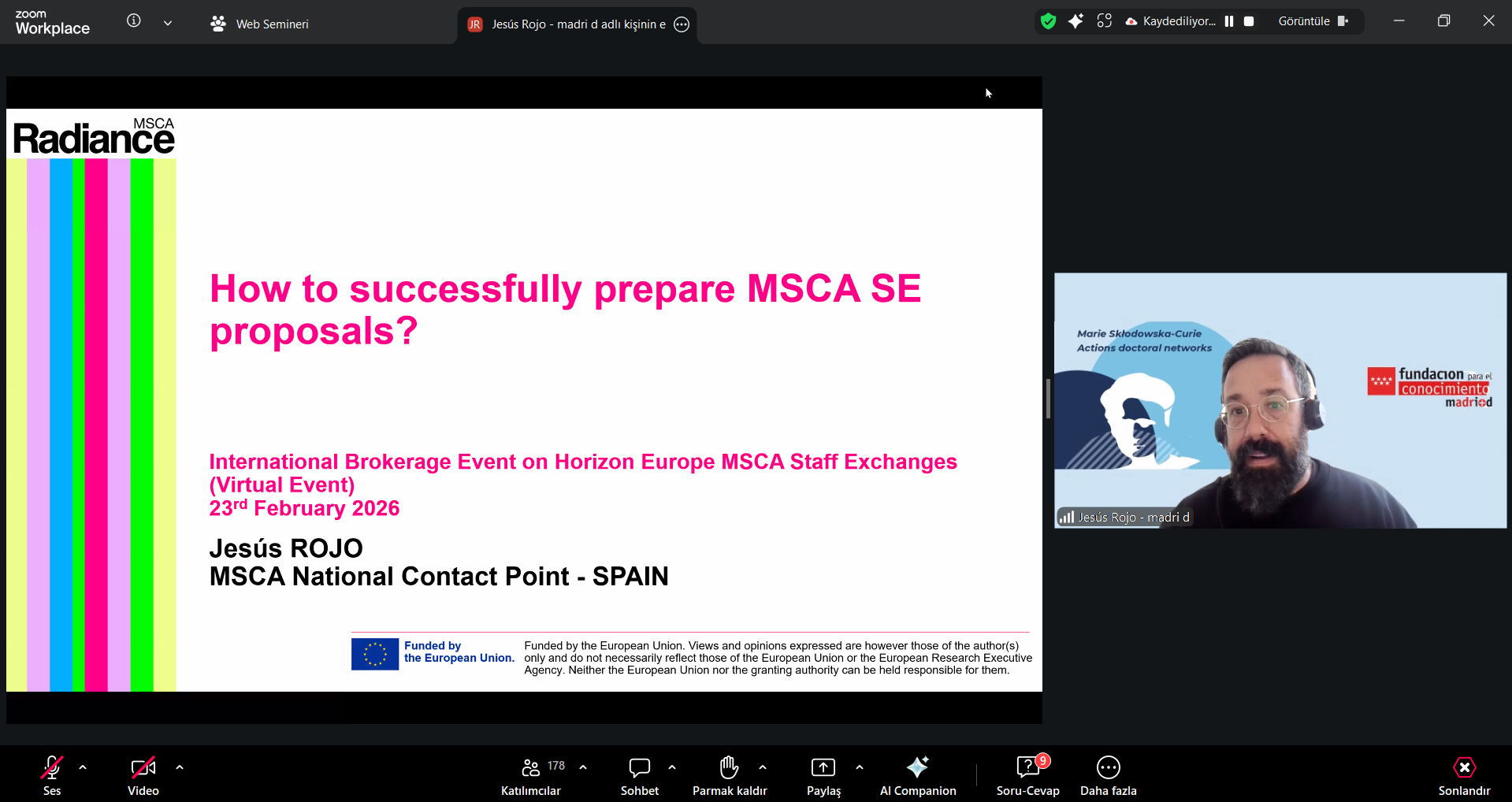 23 Şubat tarihinde TÜBİTAK, MSCA RADIANCE projesi ile iş birliği ile, Marie Sklodowska Curie Alanı (MSCA) Değişim Programı (Staff Exchanges - SE) çağrısına odaklanan uluslararası bir ağ kurma (brokerage) etkinliğini B2Match platformu üzerinden düzenledi. Etkinliğin açılışı, Dr. Burcu Göğüş Doğan tarafından, MSCA Ulusal İrtibat Noktaları Tuğba Arslan Kantarcıoğlu ve Şeyma Sayımlar’ın katılımıyla gerçekleştirildi. Açılış konuşmasında, MSCA Değişim Programı’nın programının dünya genelinde araştırma ve yenilik aktörlerini nasıl birbirine bağladığına ve Türkiye’nin 2025 çağrısındaki son başarılarına dikkat çekildi. Brüksel’de bulunan Avrupa Araştırma Yürütme Ajansı’ndan (REA) Nicoleta Petre’nin etkinliğe katılımı, Avrupa Birliği’nin bu girişime verdiği güçlü desteği ortaya koydu. Etkinliğin bir diğer konuşmacısı olan Jesús Rojo ise MSCA Değişim Programı 2026 çağrısına ilişkin kapsamlı bir bilgilendirme sunumu gerçekleştirdi.