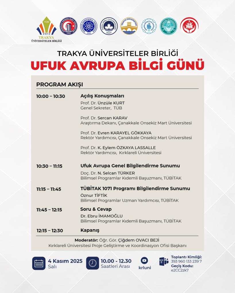 Trakya Üniversiteler Birliği (TÜB) etkinlikleri kapsamında birlik üyesi üniversitelere (Bandırma Onyedi Eylül Üniversitesi, Balıkesir Üniversitesi, Çanakkale Onsekiz Mart Üniversitesi, Kırklareli Üniversitesi, Trakya Üniversitesi ve Tekirdağ Namık Kemal Üniversitesi) yönelik olarak 4 Kasım 2025 tarihinde çevrimiçi olarak "Ufuk Avrupa Programı ve 1071-Araştırma Projeleri Destekleme Programı" bilgilendirme etkinliği düzenlenmiştir.
