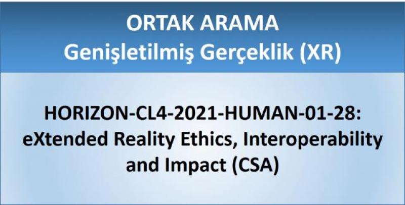 “HORIZON-CL4-2021-HUMAN-01-28: eXtended Reality Ethics, Interoperability and Impact (CSA)” başlığına sunulacak bir proje önerisi için; koordinatör adayı kuruluş, genel olarak genişletilmiş gerçeklik (XR) alanından ve özellikle sanal gerçeklik, artırılmış gerçeklik ve/veya karma gerçekliğin standartlaştırılmasıyla ilgilenen kuruluşlardan (akademi, kar amacı gütmeyen kuruluşlar, KOBİ'ler, vb.) potansiyel ortaklar aramaktadır. İlgili olabilecek kuruluşların adresinde yer alan niyet beyanı dokümanını doldurup ncpict@tubitak.gov.tr adresine 25 Haziran 2021 tarihine kadar iletmeleri beklenmektedir.